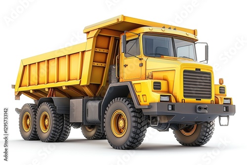 Bright yellow dump truck on a white background, showcasing its sturdy construction and rugged design.