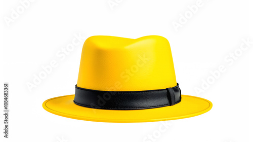 Bright yellow fedora hat, black band, white background, studio lighting, high contrast, minimalist design, fashion accessory, vibrant color, clean lines, simple elegance, photorealistic, product photo