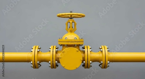 Bright yellow gas pipeline with valve and flanges on a gray wall. Industrial infrastructure for natural gas or oil transportation concept.