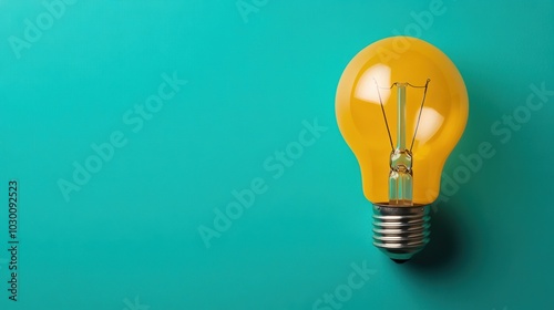 Bright Yellow Light Bulb Glowing on Turquoise Background Symbolizing Idea Innovation and Invention