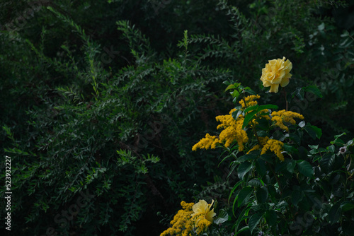 Bright yellow rose in summer garden green leafs background
