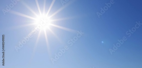 Bright yellow sun with realistic rays shining in a clear blue sky, graphic, light