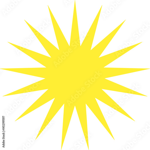 Bright yellow sunburst with sharp rays on a white background. This vibrant and energetic illustration is perfect for summer designs, cheerful backgrounds, children’s projects, or as an eye-catching