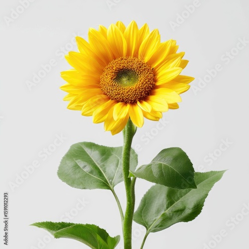 Bright Yellow Sunflower Standing Tall with Green Leaves Against a Plain White Background for Floral and Nature Imagery