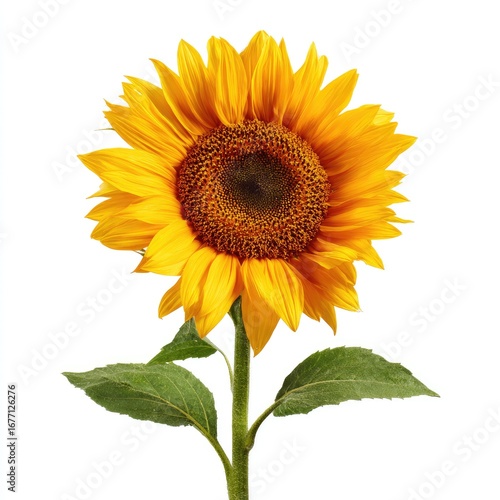 Bright yellow sunflower with green leaves against a white background
