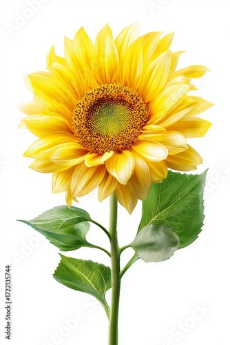 Bright yellow sunflower with green leaves isolated on white background symbolizing summer beauty botany agriculture organic growth and natural sunshine, Generative AI