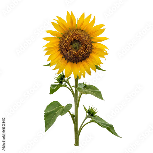 "Bright Yellow Sunflower with Green Stem and Buds Isolated on White Background"
