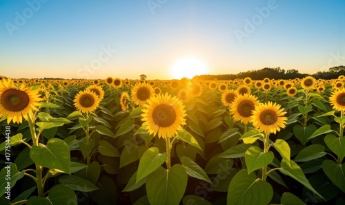 Bright yellow sunflowers blossom across a vast summer field under a clear blue sky, capturing the beauty of nature and agriculture