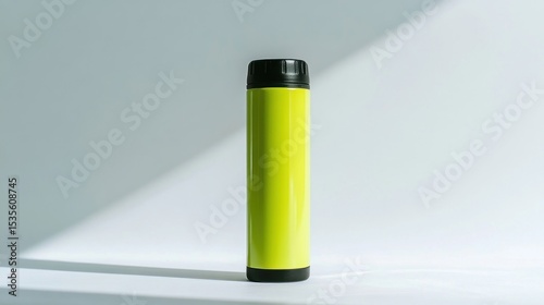 Bright Yellow Thermos with Black Lid on Gray Background with Soft Light and Shadows