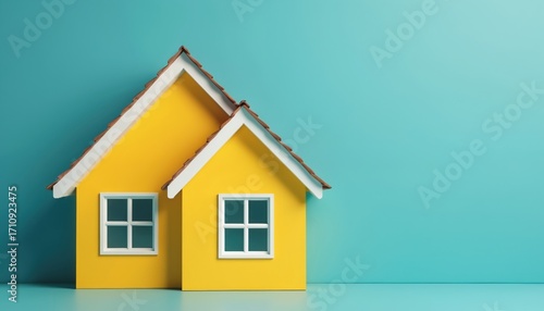 Bright yellow toy house with white windows sits against a teal background. Simple clean graphic style perfect for real estate ads and home concepts. Minimalist design.