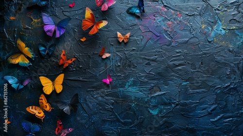 Brightly colored butterflies on a dark, textured background, vivid hues, plenty of copy space, intricate wing details, visually captivating