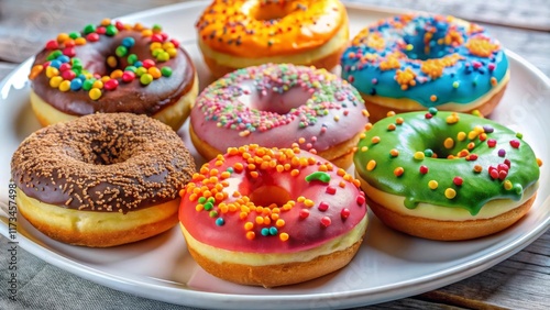 Brightly Colored Donuts with Sprinkles, Arranged in a Circle on a White Plate, Perfect for Fun Celebrations or Treats