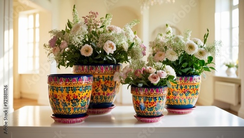 Brightly colored flower pots display a variety of fresh blooms in a sunny room