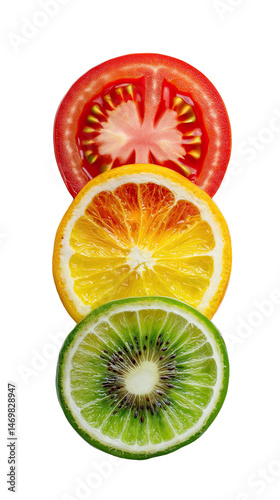 Brightly colored tomato, orange, and kiwi slices are stacked vertically to resemble a vibrant and healthy fruit composition against a stark white background.