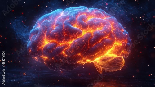 Brightly glowing brain surrounded by vibrant energy and particles in a dark cosmic background creates a stunning visual representation of thought