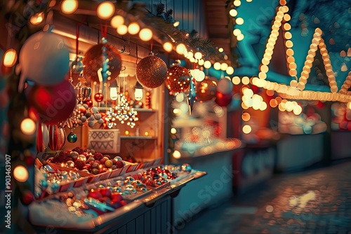 Brightly lit Christmas market with festive stalls