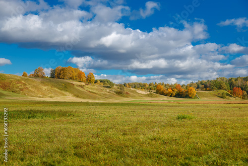 Brightly lit grassy fields and rolling hills with clusters of vibrant autumn trees