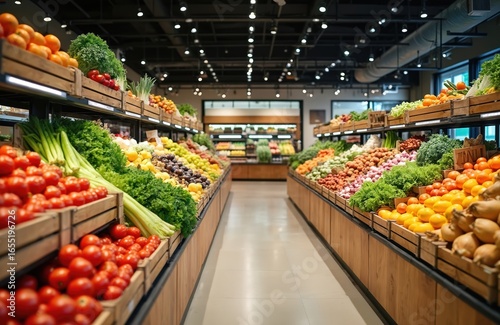 Brightly lit grocery store interior showcases vibrant, fresh produce arranged in clean, stylish wooden crates. Aisles filled with colorful fruits, vegetables, organic options invite healthy shopping.