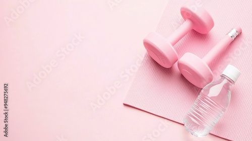 Brightly lit space featuring dumbbells, a yoga mat, and a water bottle, creating a serene atmosphere for home workouts surrounded by lush greenery