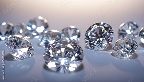 Brilliant diamonds are artfully arranged on a smooth surface, reflecting light and displaying their clarity and cut. The sparkling stones capture attention with their dazzling facets