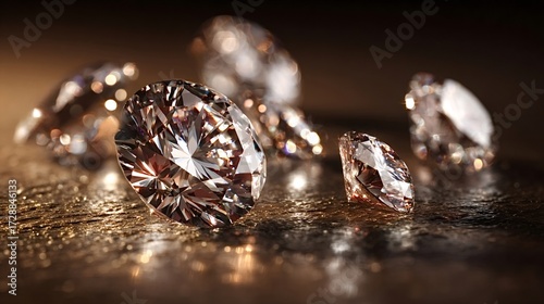 Brilliant faceted diamonds on a glowing golden surface, reflecting warm amber light for a luxurious, elegant still life of sparkle, wealth and timeless glamour