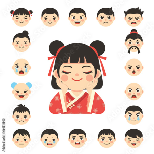 Bring charm to your designs! Flat design vector of a relaxed little Chinese girl cartoon with emoticons—happy, sad, angry, surprised—for digital projects.