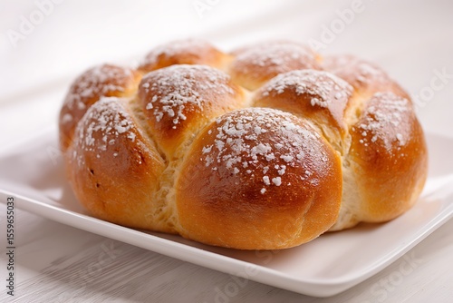 Brioche bread in a plate: Delicious brioche bread, dusted with fine powder, rests elegantly on a pristine white plate, inviting you to savor its golden goodness and delectable aroma.