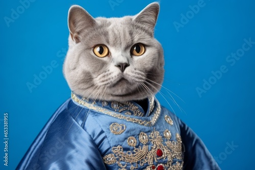british shorthair cat wearing a samurai costume against a periwinkle blue background