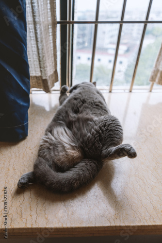 British shorthair pet blue cat likes to take a nap in a funny sleeping position