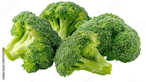Broccoli has a tree-like shape with a thick stalk and a dense cluster of small, green florets at the top isolated on white background or transpatrent png