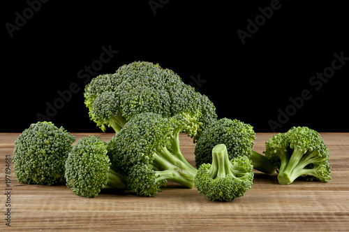 broccoli on a wooden table isolated on a black background