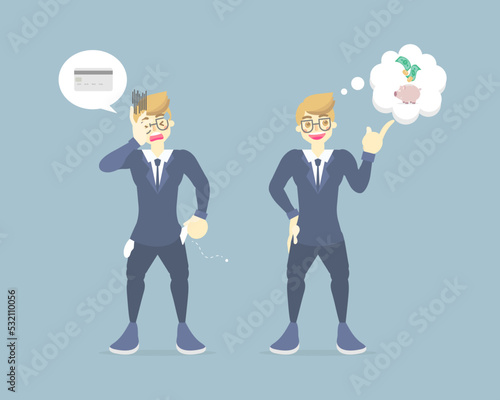 broke businessman showing empty pocket with no money with credit card, saving money, bankrupt concept, flat vector illustration cartoon character design clip art