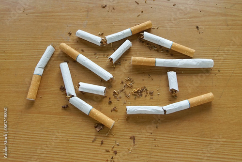 Broken and crumpled cigarettes lie on the table. Smoking cessation concept.