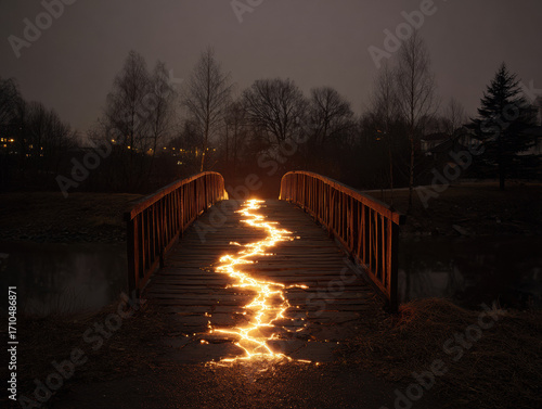 Broken bridge transforms into a glowing path of light showcasing resilience and hope at dusk