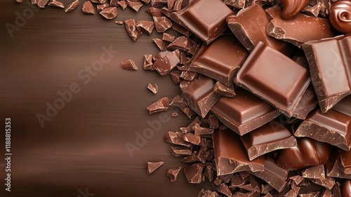 Broken chocolate bar texture crumbs concept. Rich, dark chocolate pieces and shavings create a deliciously indulgent scene on a smooth, brown surface.