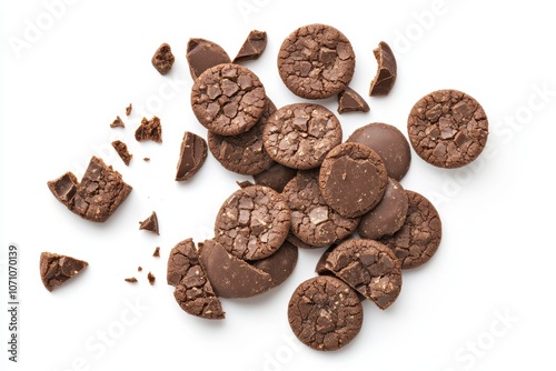 Broken chocolate cookies on a white background viewed from above