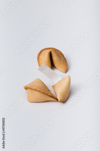 Broken fortune cookie with message paper on a white background