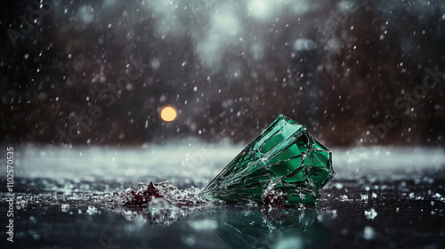 Broken green glass shard rests on a wet surface amidst falling rain droplets at dusk
