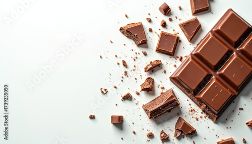 Broken milk chocolate bar rests on clean white surface. Scattered pieces surround intact segments revealing rich brown interior. Studio shot highlights texture, sweetness of confectionery treat.