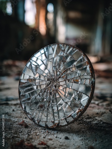 Broken Mirror Reflecting Distorted Self-Image in an Abandoned Space With Sunlight Filtering Through