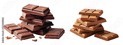 Broken or cracked dark chocolate chips or parts isolated on white background