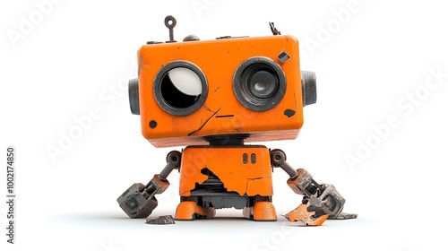 Broken toy robot with its head detached and wheels missing isolated on a clean white background The image depicts a vintage futuristic machinery in a state of disrepair and abandonment