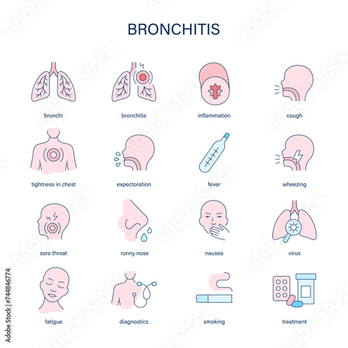 Bronchitis symptoms, diagnostic and treatment vector icons. Medical icons.