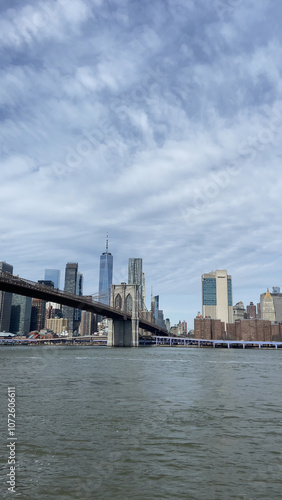 Brooklyn, New York, USA, March 31, 2024: The Brooklyn Bridge and the Financial District of Lower Manhattan, also known as FiDi.