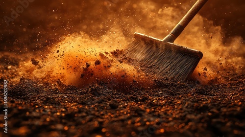 Broom sweeping dirt, dust cloud, outdoor, sunset, cleaning