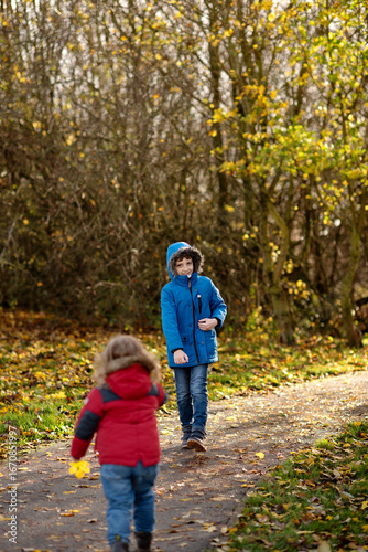 Brother and sister playing in the autumn park surrounded by golden leaves.