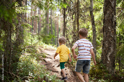 Brothers exploring forest, Finland