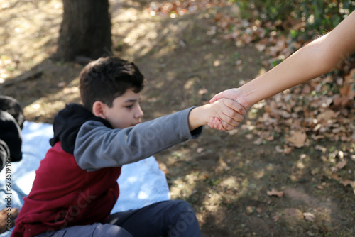 Brothers helping each other. Siblings. Concept of camaraderie, teamwork and friendship. Family spirit.