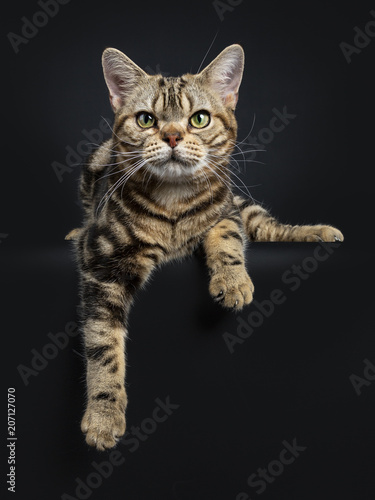 Brown and black tabby American Shorthair cat kitten laying down with paws hanging over edge isolated on black background looking at camera