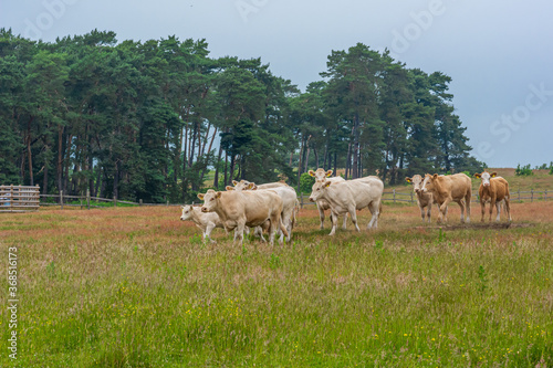Brown and white cattle in a meadow. Green grass and blue sky background